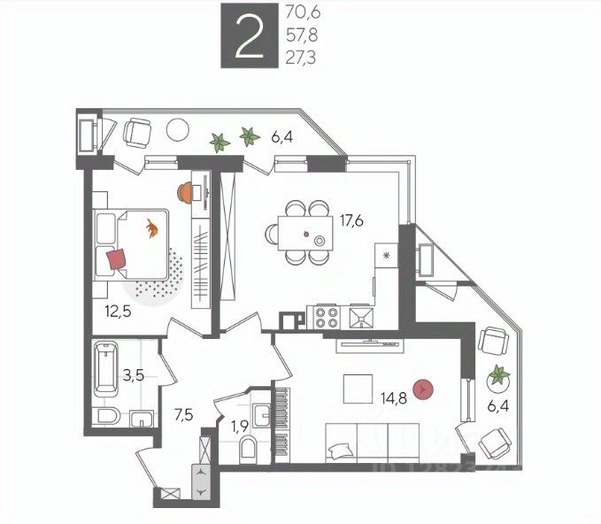 В продаже 2-комнатная квартира от застройщика! ЖК "Рекорд", г. Краснодар, Литер 5, общей площадью 70.6 кв.м., на 7 этаже.