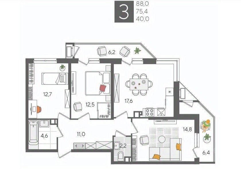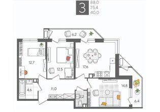 В продаже 3-комнатная квартира от застройщика! ЖК "Рекорд", г. Краснодар, Литер 5, общей площадью 88 кв.м., на 5 этаже.