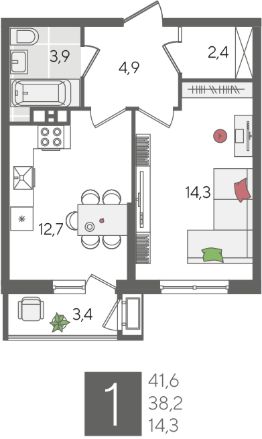 В продаже 1-комнатная квартира от застройщика! ЖК "Рекорд", г. Краснодар, Литер 5, общей площадью 41.6 кв.м., на 4 этаже.