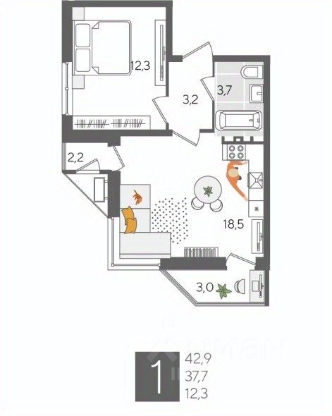 В продаже 1-комнатная квартира от застройщика! ЖК "Рекорд", г. Краснодар, Литер 5, общей площадью 42.9 кв.м., на 3 этаже.