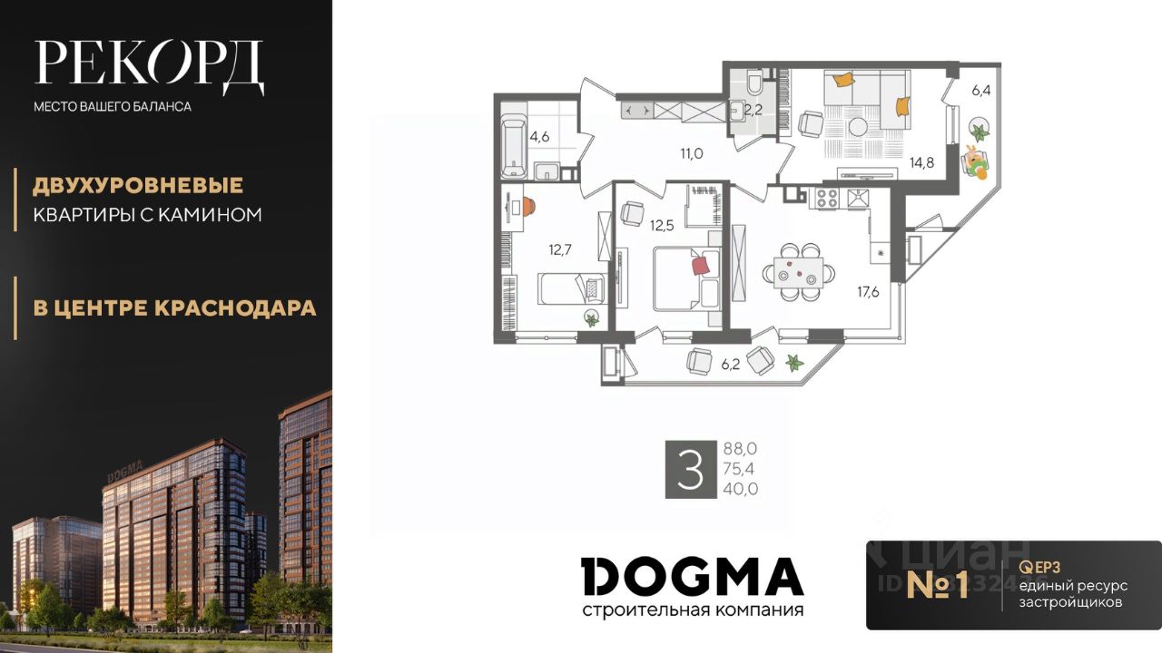В продаже 3-комнатная квартира от застройщика! ЖК "Рекорд", г. Краснодар, Литер 5, общей площадью 88 кв.м., на 3 этаже.