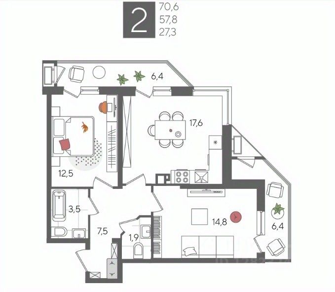 В продаже 2-комнатная квартира от застройщика! ЖК "Рекорд", г. Краснодар, Литер 5, общей площадью 70.6 кв.м., на 3 этаже.