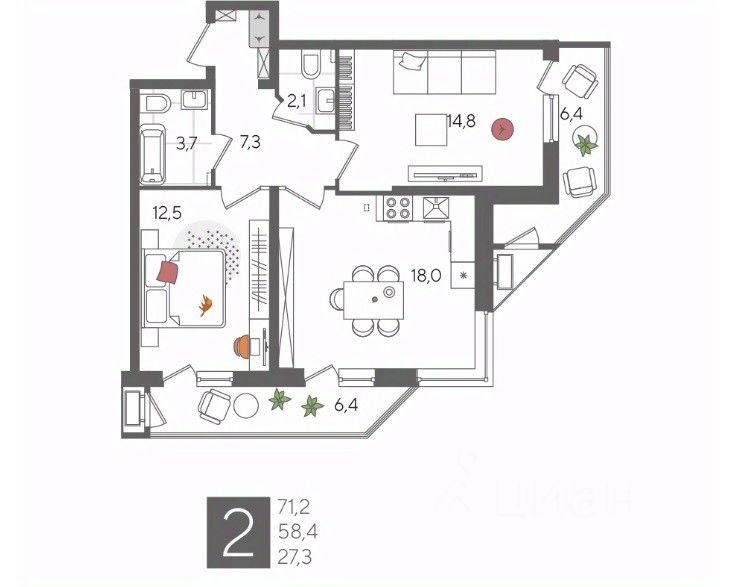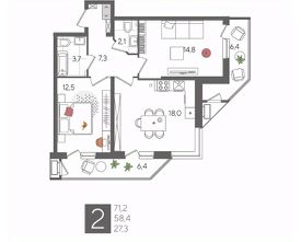 В продаже 2-комнатная квартира от застройщика! ЖК "Рекорд", г. Краснодар, Литер 5, общей площадью 71.2 кв.м., на 2 этаже.
