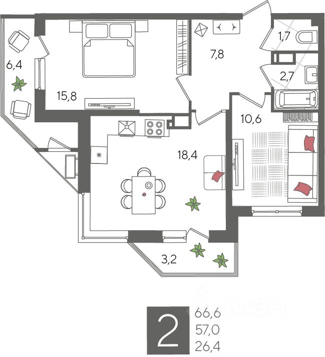 В продаже 2-комнатная квартира от застройщика! ЖК "Рекорд", г. Краснодар, Литер 2, общей площадью 66.6 кв.м., на 18 этаже.