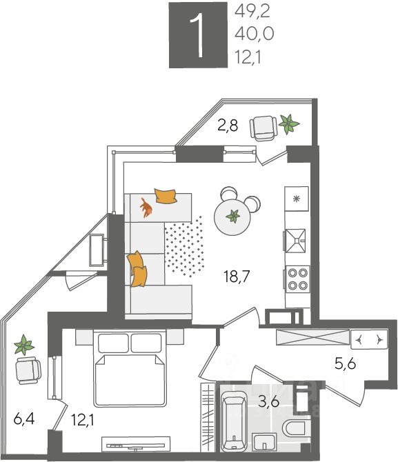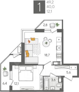 В продаже 1-комнатная квартира от застройщика! ЖК "Рекорд", г. Краснодар, Литер 2, общей площадью 49.2 кв.м., на 15 этаже.
