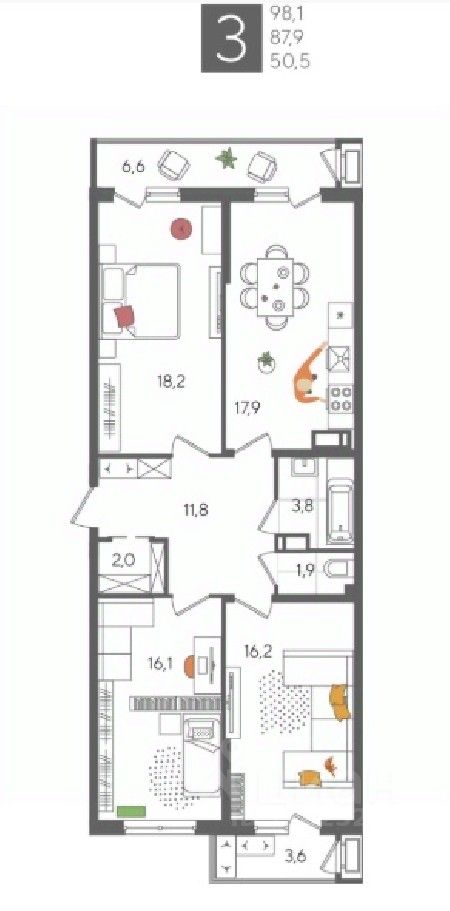 В продаже 3-комнатная квартира от застройщика! ЖК "Рекорд", г. Краснодар, Литер 2, общей площадью 98.1 кв.м., на 15 этаже.