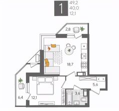 В продаже 1-комнатная квартира от застройщика! ЖК "Рекорд", г. Краснодар, Литер 2, общей площадью 49.2 кв.м., на 11 этаже.