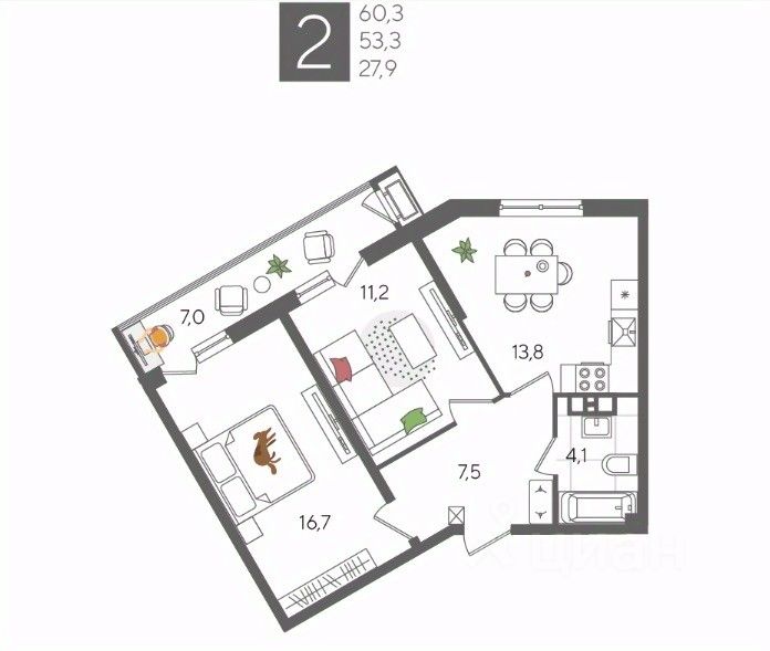 В продаже 2-комнатная квартира от застройщика! ЖК "Рекорд", г. Краснодар, Литер 2, общей площадью 60.3 кв.м., на 10 этаже.