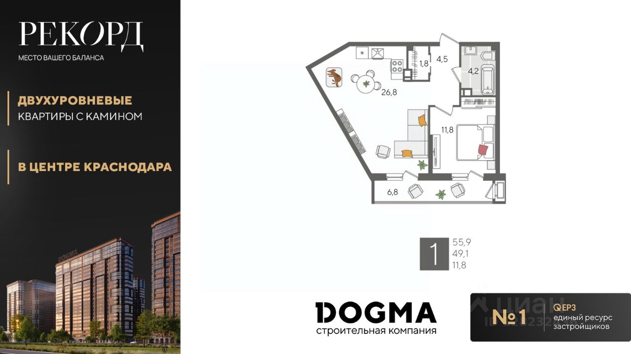 В продаже 1-комнатная квартира от застройщика! ЖК "Рекорд", г. Краснодар, Литер 2, общей площадью 55.9 кв.м., на 10 этаже.