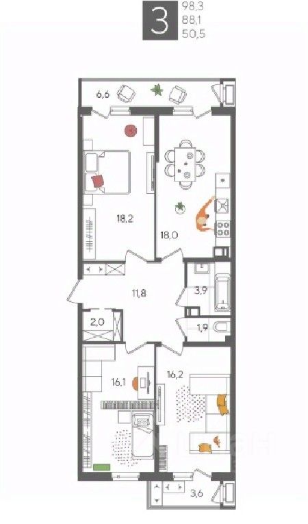В продаже 3-комнатная квартира от застройщика! ЖК "Рекорд", г. Краснодар, Литер 2, общей площадью 98.3 кв.м., на 8 этаже.