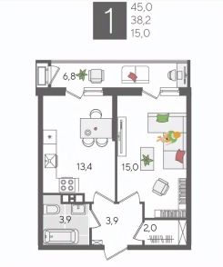 В продаже 1-комнатная квартира от застройщика! ЖК "Рекорд", г. Краснодар, Литер 2, общей площадью 45 кв.м., на 5 этаже.
