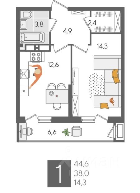 В продаже 1-комнатная квартира от застройщика! ЖК "Рекорд", г. Краснодар, Литер 2, общей площадью 44.6 кв.м., на 23 этаже.