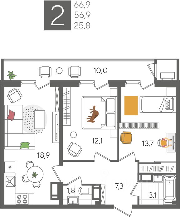 В продаже 2-комнатная квартира от застройщика! ЖК "Рекорд", г. Краснодар, Литер 2, общей площадью 66.9 кв.м., на 22 этаже.