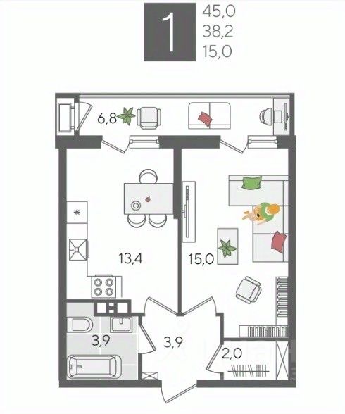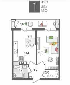 В продаже 1-комнатная квартира от застройщика! ЖК "Рекорд", г. Краснодар, Литер 2, общей площадью 45 кв.м., на 9 этаже.