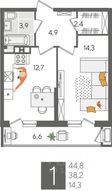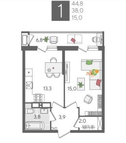 В продаже 1-комнатная квартира от застройщика! ЖК "Рекорд", г. Краснодар, Литер 2, общей площадью 44.8 кв.м., на 6 этаже.