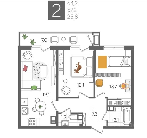 В продаже 2-комнатная квартира от застройщика! ЖК "Рекорд", г. Краснодар, Литер 2, общей площадью 64.2 кв.м., на 3 этаже.