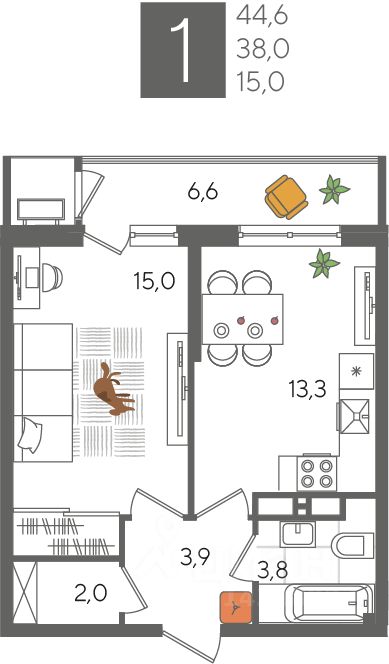 В продаже 1-комнатная квартира от застройщика! ЖК "Рекорд", г. Краснодар, Литер 2, общей площадью 44.6 кв.м., на 24 этаже.