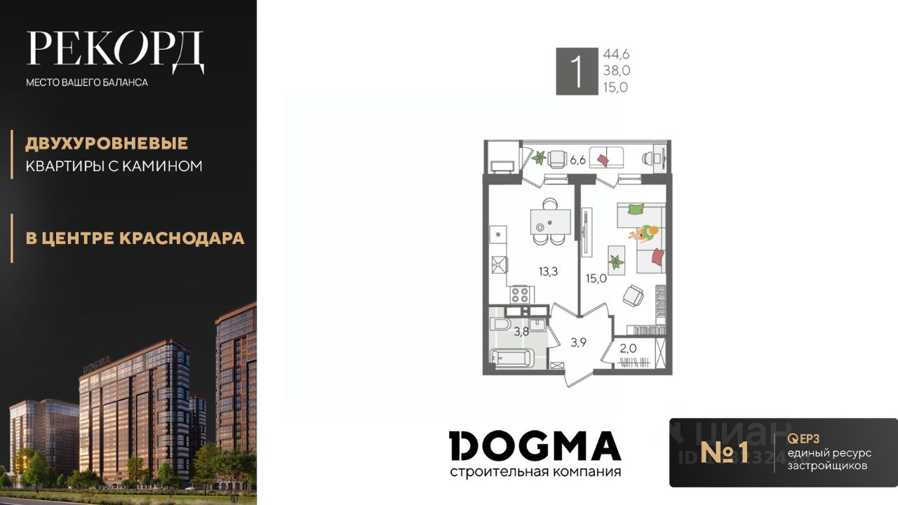 В продаже 1-комнатная квартира от застройщика! ЖК "Рекорд", г. Краснодар, Литер 2, общей площадью 44.6 кв.м., на 24 этаже.