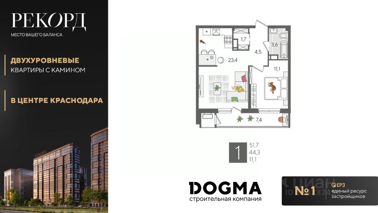 В продаже 1-комнатная квартира от застройщика! ЖК "Рекорд", г. Краснодар, Литер 2, общей площадью 51.7 кв.м., на 24 этаже.