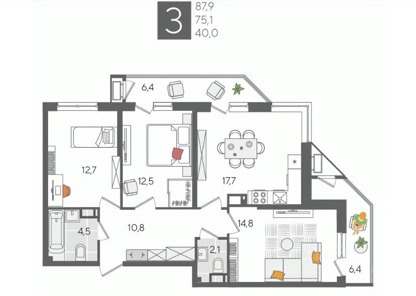 В продаже 3-комнатная квартира от застройщика! ЖК "Рекорд", г. Краснодар, Литер 2, общей площадью 87.9 кв.м., на 14 этаже.