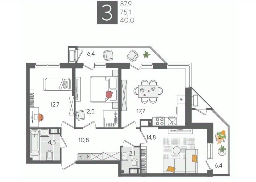 В продаже 3-комнатная квартира от застройщика! ЖК "Рекорд", г. Краснодар, Литер 2, общей площадью 87.9 кв.м., на 13 этаже.