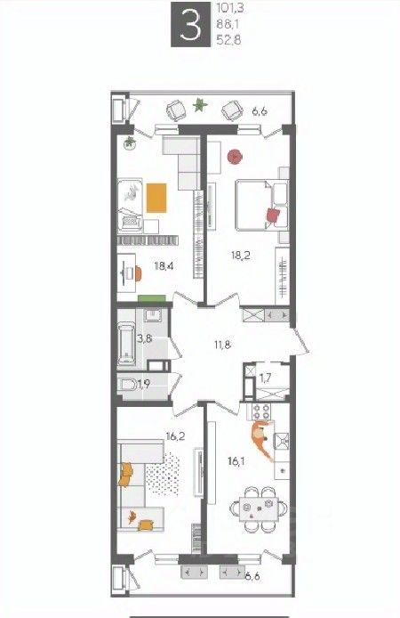 В продаже 3-комнатная квартира от застройщика! ЖК "Рекорд", г. Краснодар, Литер 2, общей площадью 101.3 кв.м., на 12 этаже.