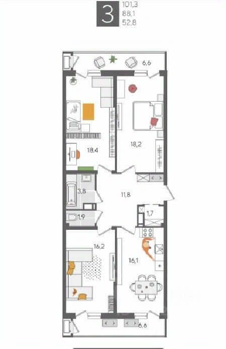 В продаже 3-комнатная квартира от застройщика! ЖК "Рекорд", г. Краснодар, Литер 2, общей площадью 101.3 кв.м., на 11 этаже.