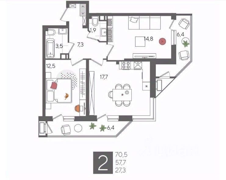 В продаже 2-комнатная квартира от застройщика! ЖК "Рекорд", г. Краснодар, Литер 2, общей площадью 70.5 кв.м., на 7 этаже.