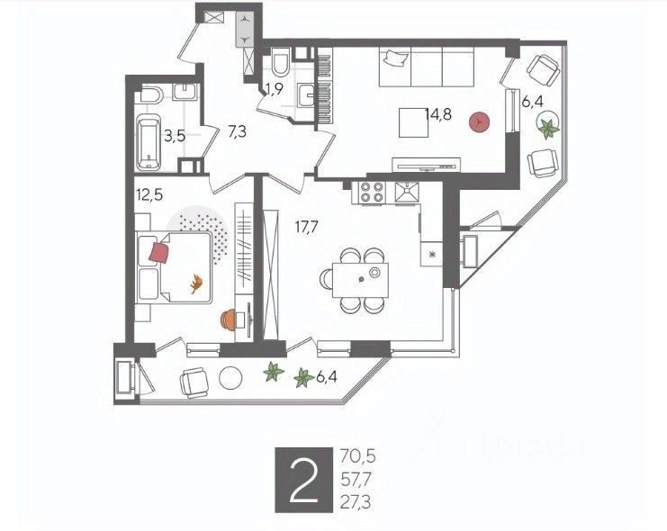 В продаже 2-комнатная квартира от застройщика! ЖК "Рекорд", г. Краснодар, Литер 2, общей площадью 70.5 кв.м., на 5 этаже.