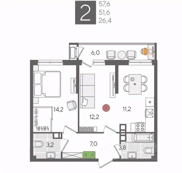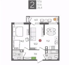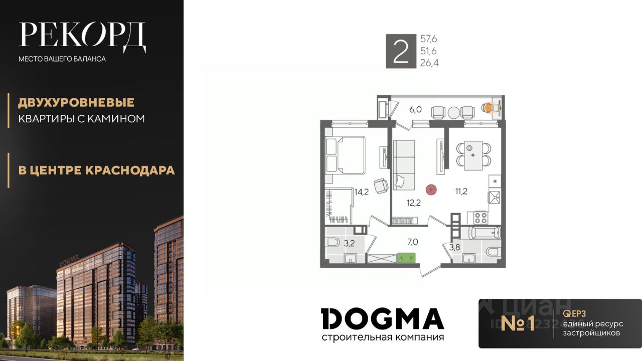 В продаже 2-комнатная квартира от застройщика! ЖК "Рекорд", г. Краснодар, Литер 2, общей площадью 57.6 кв.м., на 3 этаже.