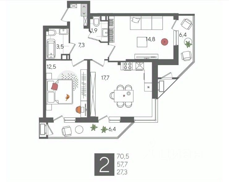 В продаже 2-комнатная квартира от застройщика! ЖК "Рекорд", г. Краснодар, Литер 2, общей площадью 70.5 кв.м., на 3 этаже.