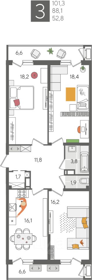 В продаже 3-комнатная квартира от застройщика! ЖК "Рекорд", г. Краснодар, Литер 1, общей площадью 101.3 кв.м., на 24 этаже.