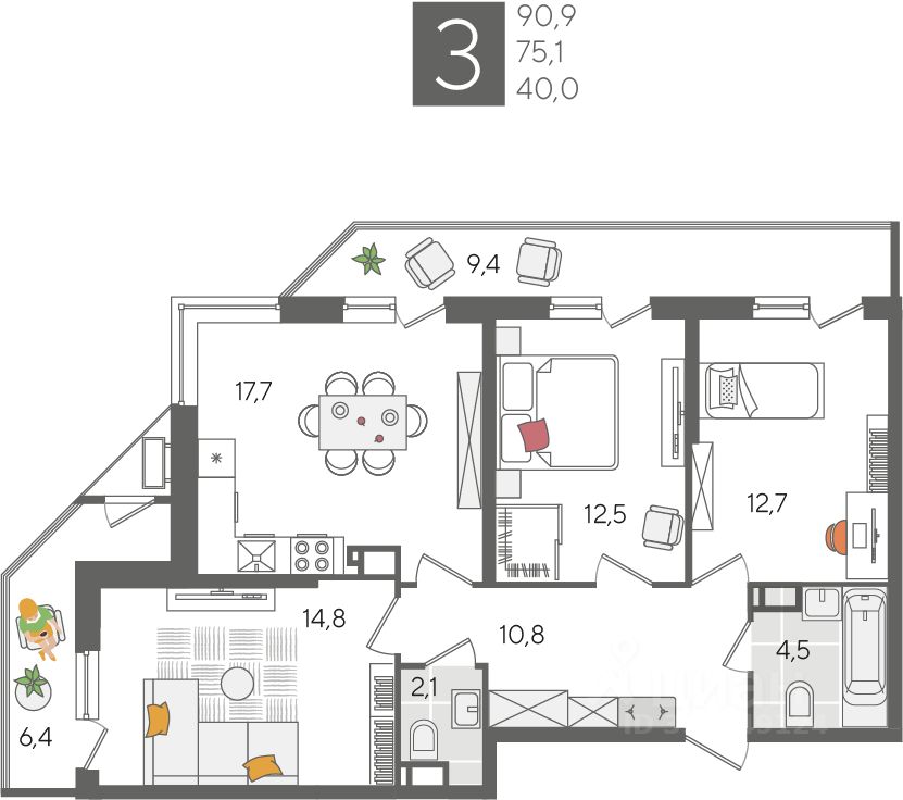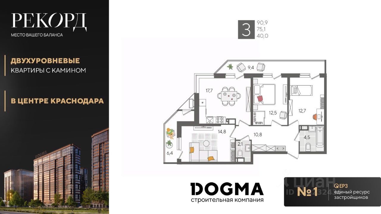 В продаже 3-комнатная квартира от застройщика! ЖК "Рекорд", г. Краснодар, Литер 1, общей площадью 90.9 кв.м., на 22 этаже.