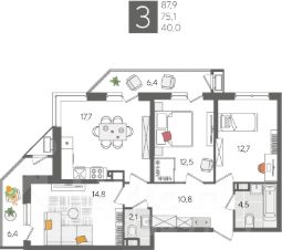 В продаже 3-комнатная квартира от застройщика! ЖК "Рекорд", г. Краснодар, Литер 1, общей площадью 87.9 кв.м., на 21 этаже.