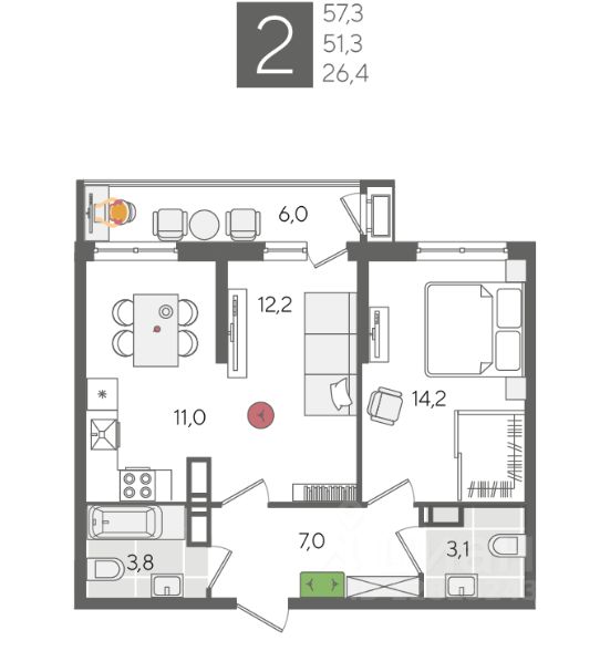 В продаже 2-комнатная квартира от застройщика! ЖК "Рекорд", г. Краснодар, Литер 1, общей площадью 57.3 кв.м., на 20 этаже.