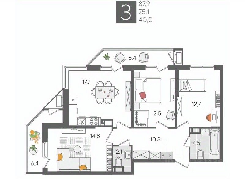 В продаже 3-комнатная квартира от застройщика! ЖК "Рекорд", г. Краснодар, Литер 1, общей площадью 87.9 кв.м., на 18 этаже.