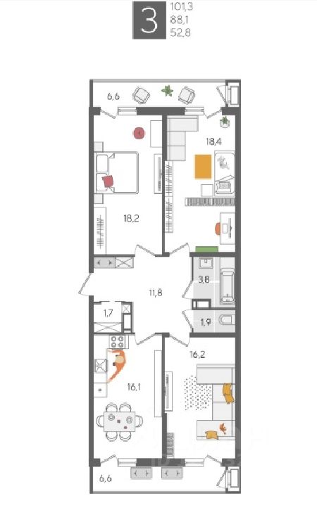 В продаже 3-комнатная квартира от застройщика! ЖК "Рекорд", г. Краснодар, Литер 1, общей площадью 101.3 кв.м., на 11 этаже.