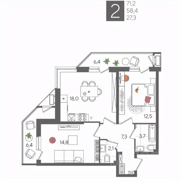 В продаже 2-комнатная квартира от застройщика! ЖК "Рекорд", г. Краснодар, Литер 1, общей площадью 71.2 кв.м., на 2 этаже.