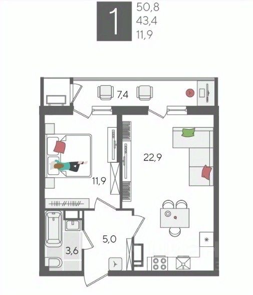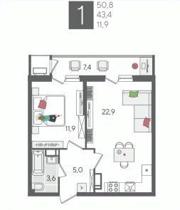В продаже 1-комнатная квартира от застройщика! ЖК "Рекорд", г. Краснодар, Литер 1, общей площадью 50.8 кв.м., на 24 этаже.