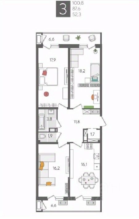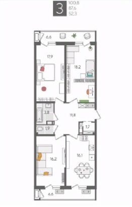 В продаже 3-комнатная квартира от застройщика! ЖК "Рекорд", г. Краснодар, Литер 1, общей площадью 100.8 кв.м., на 13 этаже.