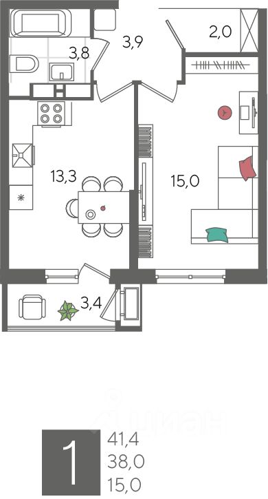 В продаже 1-комнатная квартира от застройщика! ЖК "Рекорд", г. Краснодар, Литер 1, общей площадью 41.4 кв.м., на 11 этаже.