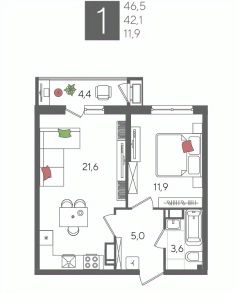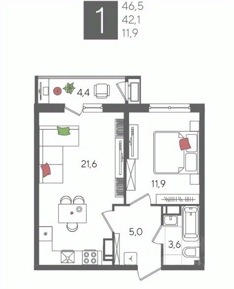 В продаже 1-комнатная квартира от застройщика! ЖК "Рекорд", г. Краснодар, Литер 1, общей площадью 46.7 кв.м., на 10 этаже.