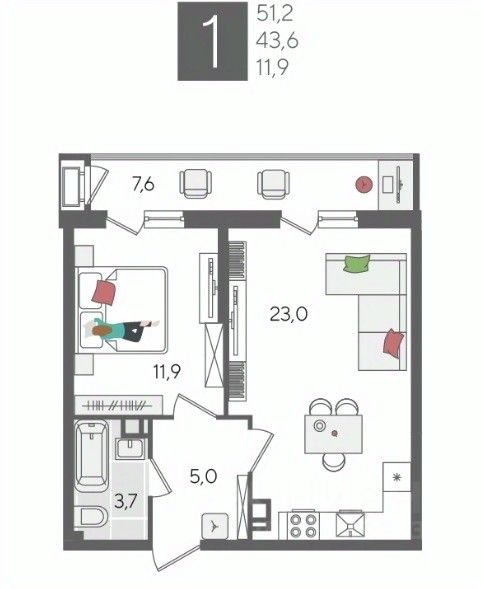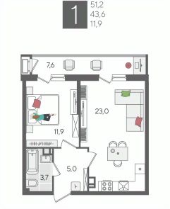 В продаже 1-комнатная квартира от застройщика! ЖК "Рекорд", г. Краснодар, Литер 1, общей площадью 51.2 кв.м., на 9 этаже.