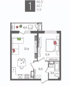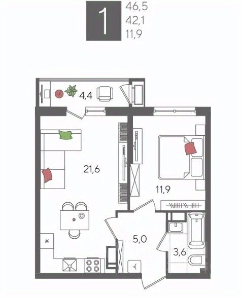 В продаже 1-комнатная квартира от застройщика! ЖК "Рекорд", г. Краснодар, Литер 1, общей площадью 46.7 кв.м., на 6 этаже.