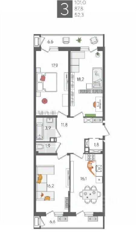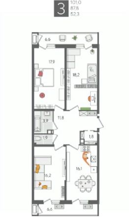 В продаже 3-комнатная квартира от застройщика! ЖК "Рекорд", г. Краснодар, Литер 1, общей площадью 101 кв.м., на 4 этаже.