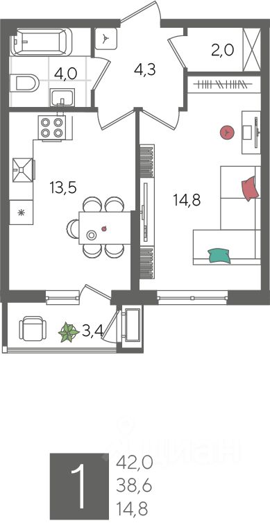 В продаже 1-комнатная квартира от застройщика! ЖК "Рекорд", г. Краснодар, Литер 1, общей площадью 42 кв.м., на 2 этаже.