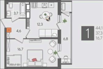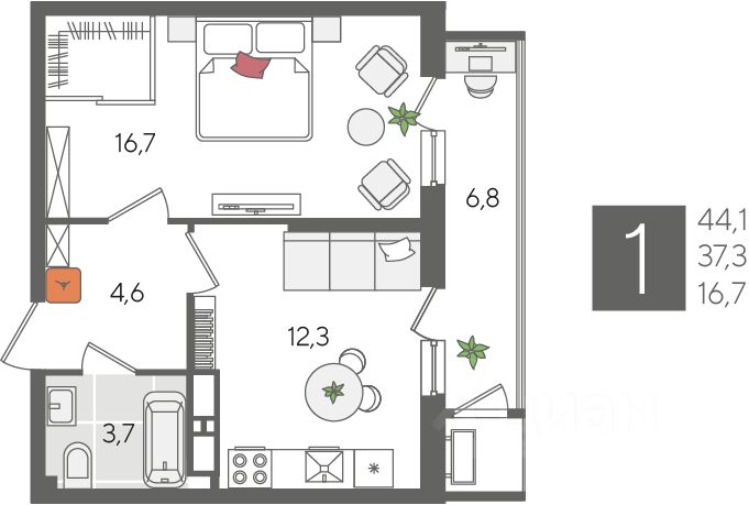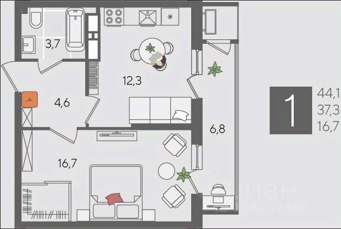 В продаже 1-комнатная квартира от застройщика! ЖК "Рекорд", г. Краснодар, Литер 1, общей площадью 44.1 кв.м., на 24 этаже.