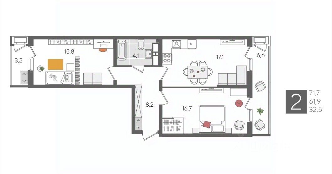 В продаже 2-комнатная квартира от застройщика! ЖК "Рекорд", г. Краснодар, Литер 1, общей площадью 71.7 кв.м., на 24 этаже.