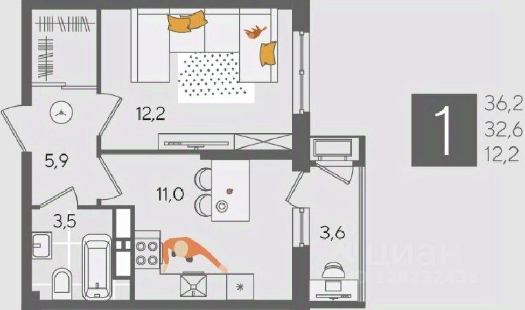 В продаже 1-комнатная квартира от застройщика! ЖК "Рекорд", г. Краснодар, Литер 1, общей площадью 36.2 кв.м., на 14 этаже.