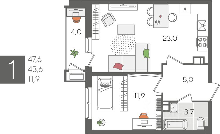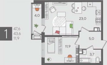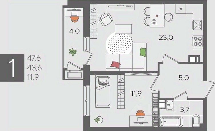 В продаже 1-комнатная квартира от застройщика! ЖК "Рекорд", г. Краснодар, Литер 1, общей площадью 47.6 кв.м., на 9 этаже.